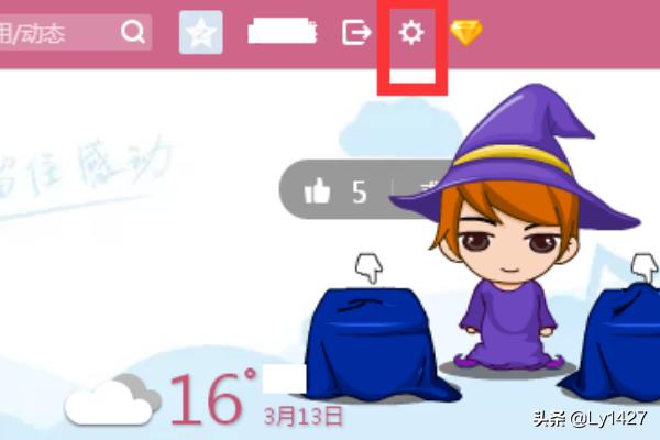 1、首先先打开qq空间,打开之后会看到页面的右上角有一个设置选项,也就是类似齿轮的图标,将鼠标移到该图标。