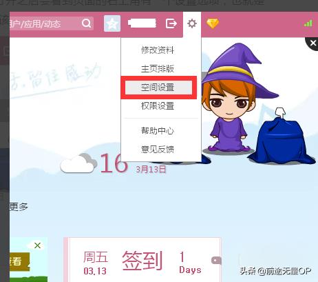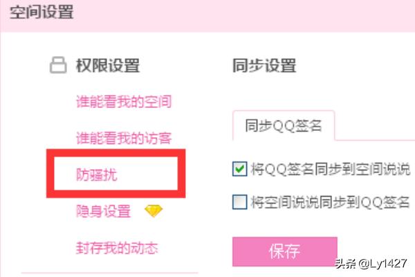 2、移到该图标之后会下拉选项,在下拉的选项里我们选择“空间设置”选项。然后会看到一个“防骚扰”设置选项,选择该选项。